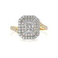 The Aurora ring features a striking emerald-cut center diamond framed by a refined double halo, creating exceptional brilliance and depth. The pavé-set band enhances its luxurious presence, while the elevated, sculptural setting adds dimension and sophistication. This design blends timeless elegance with modern glamour, making Aurora a captivating symbol of enduring beauty and refined craftsmanship.