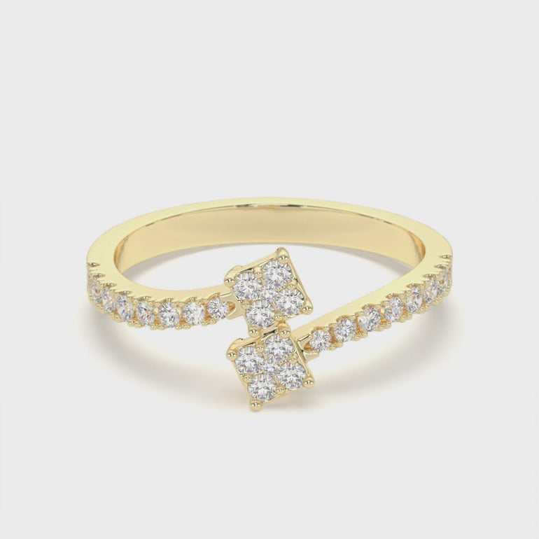 The Hélène ring is a graceful and sophisticated design featuring a sleek bypass band. At each end, two square clusters of shimmering diamonds create a striking focal point, symbolizing elegance and harmony. The band is adorned with pavé-set diamonds, adding brilliance and refinement. A timeless piece, Hélène beautifully blends modern elegance with classic charm.