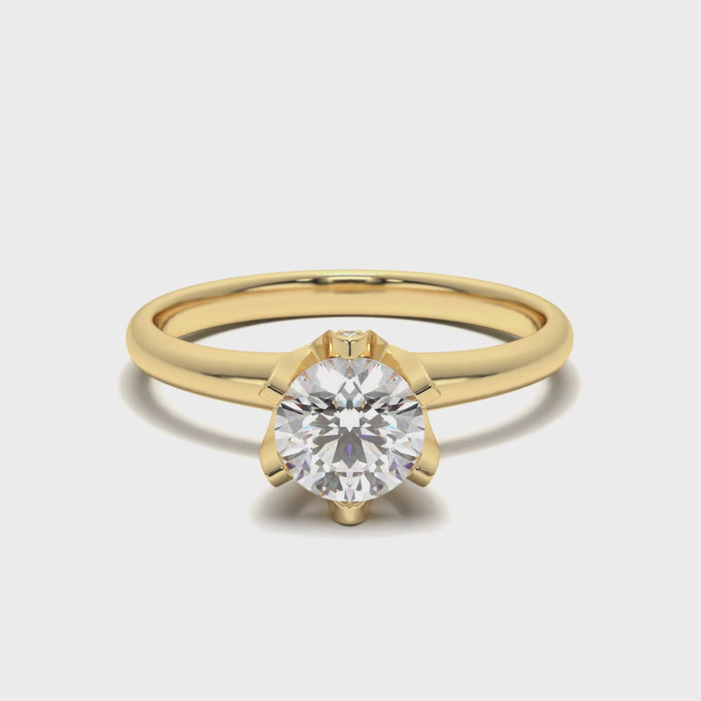 Béatrice is an elegant solitaire ring that blends timeless sophistication with modern detail. Featuring a brilliant round cut diamond held in a refined six-claw setting, it reveals a hidden pavé-accented halo beneath the stone. The sleek band enhances the diamond's prominence, while the intricate side detailing adds a delicate touch of sparkle and artistry.