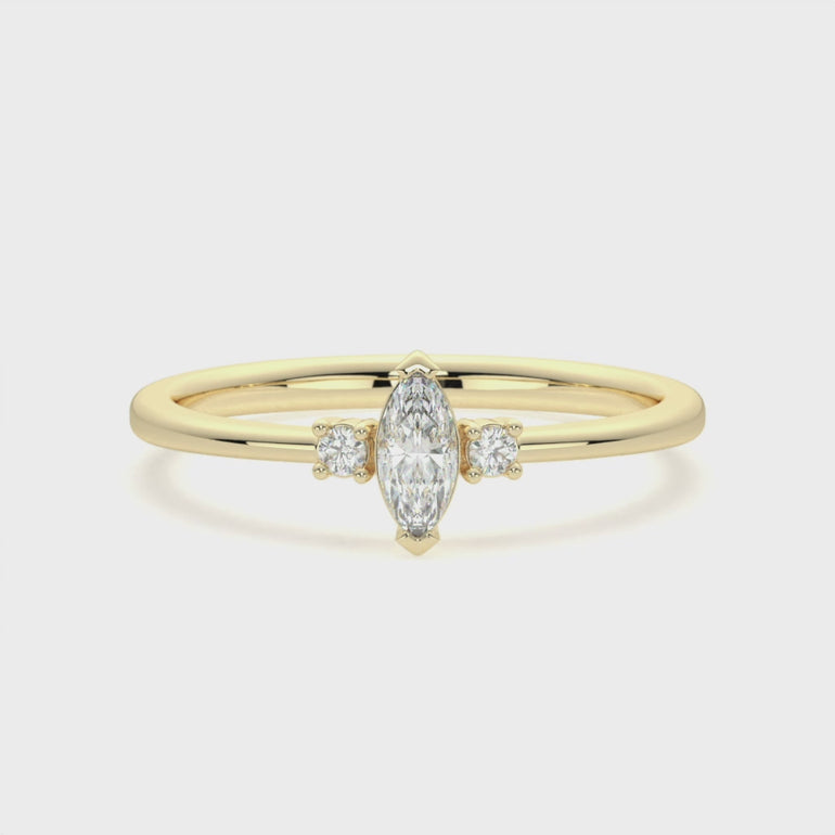 The Charlène ring exudes refined elegance with its marquise-cut center diamond, gracefully accented by two petite round diamonds on each side. Set upon a polished band, the design balances modern minimalism with timeless sophistication. Its delicate proportions and radiant sparkle make Charlène a graceful symbol of enduring beauty, perfect for those who cherish understated luxury.