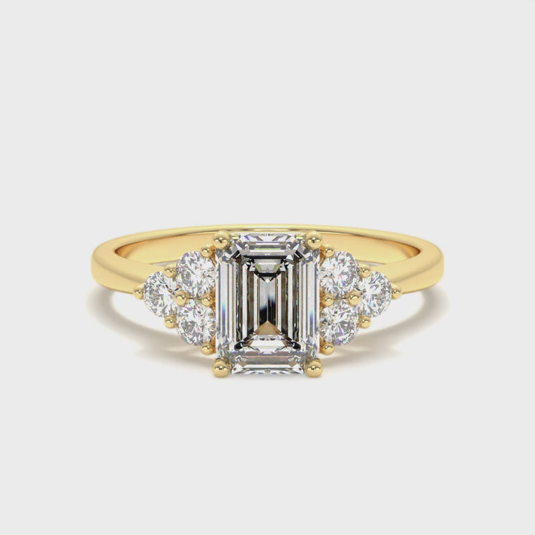Chiara features a striking step-cut center diamond framed by a graceful arrangement of round brilliant diamonds, creating a balanced cluster that enhances brilliance and depth. The refined band and elevated setting provide elegance and lightness, allowing the stones to shine beautifully. Sophisticated and timeless, Chiara embodies modern refinement with a delicate vintage-inspired silhouette.