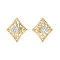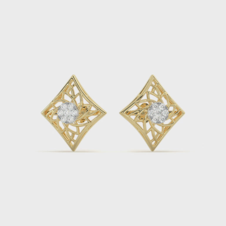 These exquisite earrings feature an intricate lattice design, forming a distinctive diamond-shaped silhouette. At the center of each piece, a brilliant round-cut diamond is elegantly nestled, adding a radiant focal point. The openwork detailing showcases exceptional craftsmanship, combining modern sophistication with timeless elegance. These earrings are the perfect embodiment of refined luxury, ideal for both special occasions and everyday elegance.